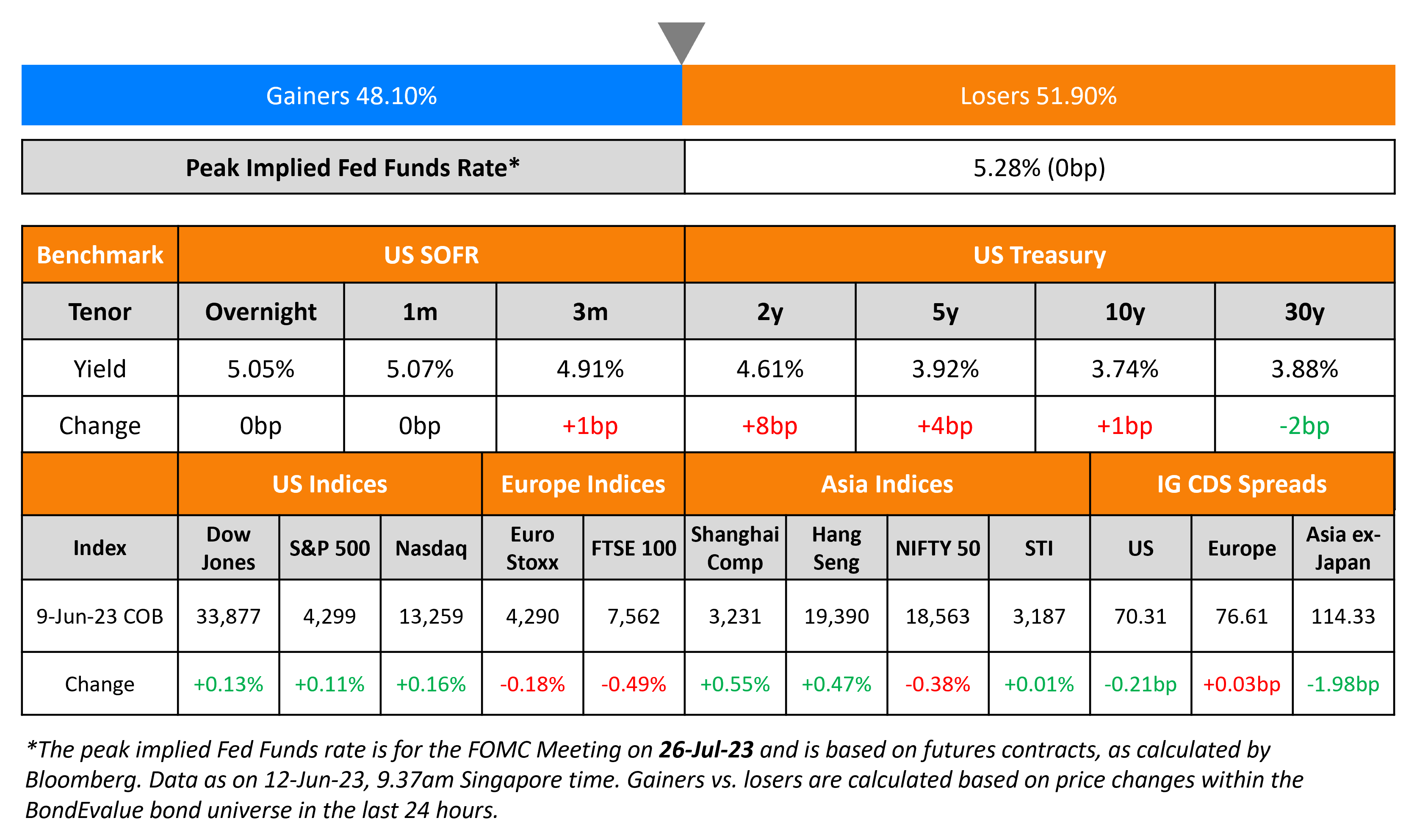 US Treasury yields moved higher on Friday led by the 2Y that rose 8bp. Expectations continue for a status quo at the 13-14 June FOMC meeting while markets are pricing-in a 53% probability of a 25-50bp rate hike in the July meeting. The peak Fed Funds Rate was unchanged at 5.28% for July. All eyes focus on the US CPI data due this week – expectations are for a 4.1% print in the headline CPI and 5.2% in the Core CPI for May. This compares to 4.9% and 5.5% in the April data. Equity indices ended higher on Friday with the S&P and Nasdaq up by 0.1-0.2%. US IG and HY CDS spreads tightened 0.2bp and 0.7bp respectively.