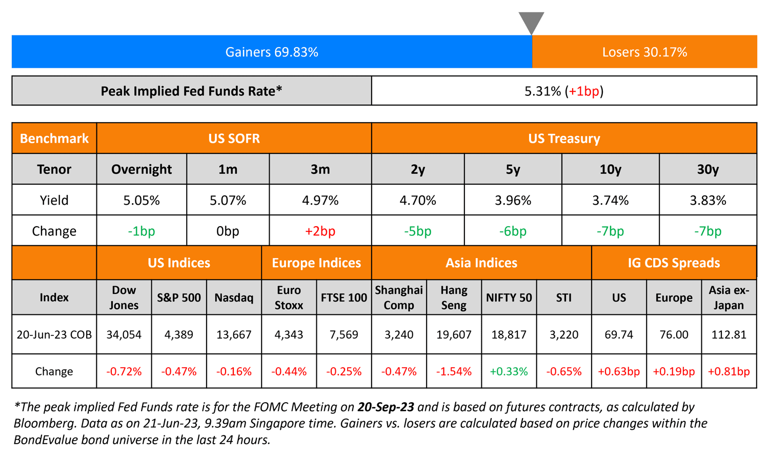 US Treasury yields eased by 5-7bp on Tuesday with the 2Y and 10Y now at 4.70% and 3.74% respectively. This comes after hawkish comments from Fed nominees including two current governors who stated that bringing inflation down is their top priority (scroll to Talking Heads for details). On the data front, US housing starts rose to a seasonally adjusted 1.631mn units for May, up from April’s 1.34mn. The 291k increase in starts is the highest since January 1990. Markets continue to price in a 25bp hike in July and expect them to stay at that level till the end of the year, as per CME probabilities. The peak Fed Funds rate moved 1bp higher to 5.31%. US equity indices saw its second consecutive day in the red with the S&P and Nasdaq down 0.47% and 0.16% respectively.