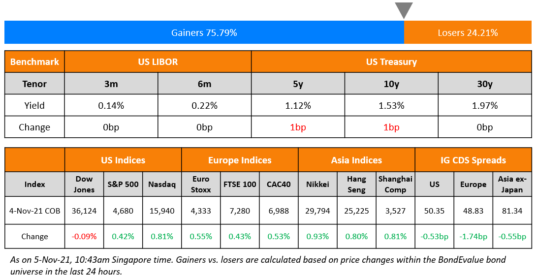The US Federal Reserve said it would reduce Treasury purchases by $10bn and mortgage-backed securities (MBS) by $5bn per month. The Bank of England surprised markets by keeping rates steady with the MPC voting 7:2 against a rate hike vs. predictions of a 6:3 majority for a hike. US jobless claims for the prior week came at 269k, better than forecasts of 275k. Focus shifts to today’s NFP data for October, with economists expecting a 450k print.