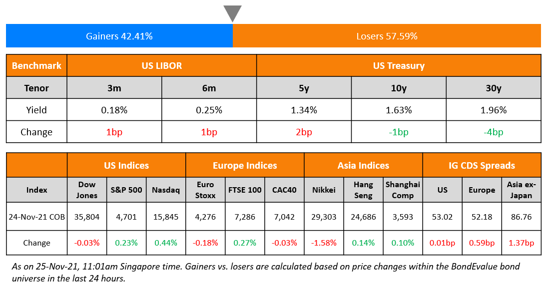 US equities ended slightly higher with the S&P up 0.2% and Nasdaq up 0.4%. Sectoral gains were led by Real Estate and Energy, up over 1% while losses were led by Materials, down 0.7%. US 10Y Treasury yields inched 2bp higher to 1.64%. European markets were mixed with the DAX down 0.4%, CAC flat and FTSE up 0.3%. Brazil’s Bovespa ended 0.8% higher. In the Middle East, UAE’s ADX and Saudi TASI were up 0.8% and 1% respectively. Asian markets have opened broadly lower – Shanghai, HSI and STI were down ~0.2% each while Nikkei was up 0.7%. US IG CDS spreads were flat and HY CDS spreads were 0.1bp wider. EU Main CDS spreads were 0.6bp wider and Crossover CDS spreads were 2.3bp wider. Asia ex-Japan CDS spreads widened 1.5bp.