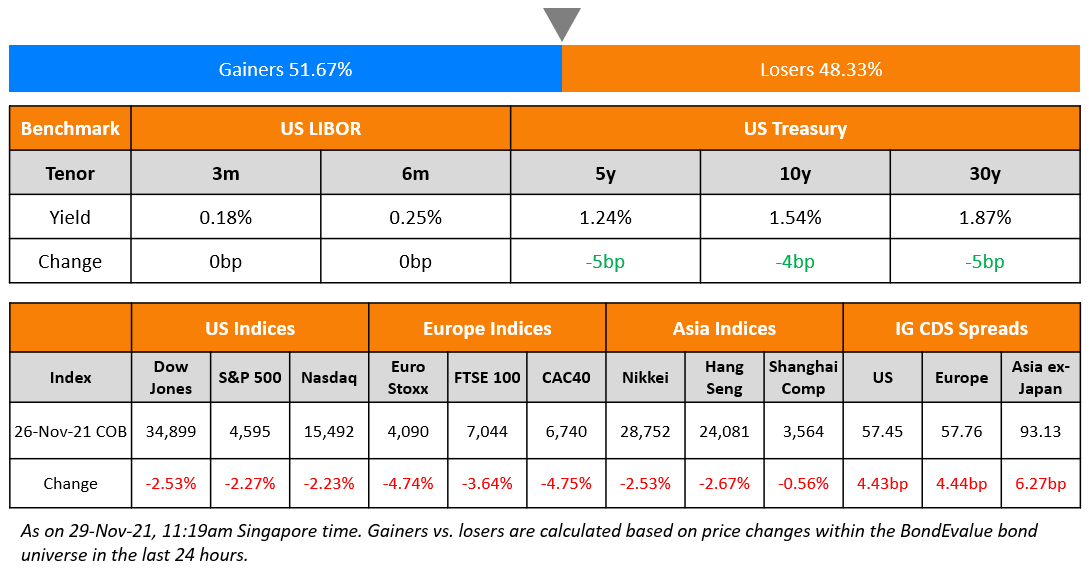 US equity markets dropped sharply with the S&P and Nasdaq falling 2.3% and 2.2% respectively on Friday after concerns over the new Omicron B.1.1.529 variant shook global markets. All sectors ended in the red led by Energy, down 4.1% and Financials down 3.3%. US 10Y Treasury yields fell ~13bp to 1.47% on Friday following the latest variant’s concerns. It has recovered slightly today to 1.54%. European markets were lower with the DAX, CAC and FTSE down 4.2%, 4.8% and 3.6% respectively. Brazil’s Bovespa ended 3.4% lower. In the Middle East, UAE’s ADX was down 1.8% while Saudi TASI was down 4.5% on Sunday. Asian markets have opened lower – Shanghai, HSI, STI and Nikkei were down 0.1%, 0.6%, 1% and 0.6% respectively. US IG CDS spreads and HY CDS spreads widened 4.4bp and 20.7bp respectively. EU Main CDS spreads were 4.4bp wider and Crossover CDS spreads were 21.9bp wider. Asia ex-Japan CDS spreads widened 6.3bp.