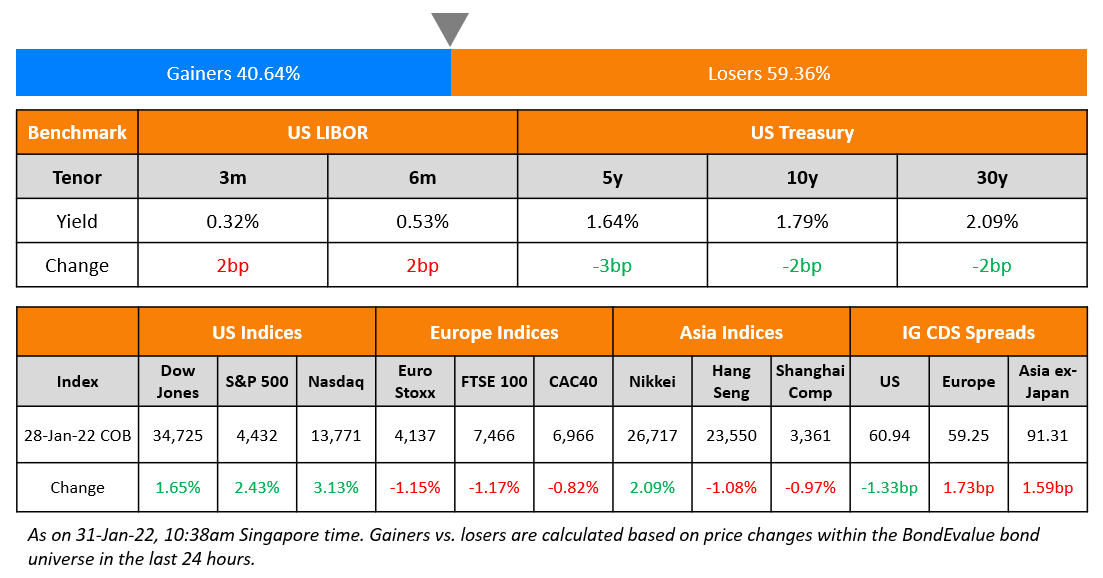 US equity markets saw a sharp rally on Friday with the S&P and Nasdaq ending 2.4% and 3.1% higher. Sectoral gains were led by IT and Real Estate, up 4.3% and 3.4% each. US 10Y Treasury yields eased 2bp at 1.79%. European markets recovered with the DAX, CAC and FTSE down 1.3%, 0.8% and 1.2%. Brazil’s Bovespa closed 0.6% higher. In the Middle East, UAE’s ADX was up 0.4% and Saudi TASI closed 0.7% higher on Sunday. Asian markets have opened broadly higher with HSI, STI and Nikkei up 1.3%, 0.5% and 1.5% while Shanghai was down 1%. US IG CDS spreads were 1.3bp wider and HY CDS spreads were 5.1bp tighter, EU Main CDS spreads were 1.7bp wider and Crossover CDS spreads were 5.7bp wider. Asia ex-Japan CDS spreads were 1.6bp wider.