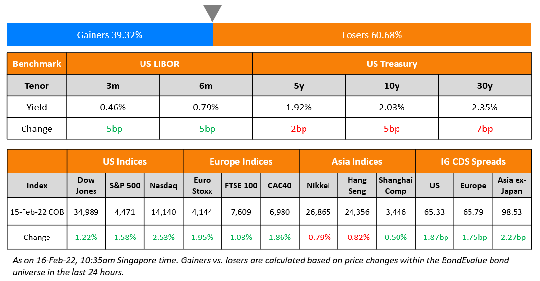 S&P and Nasdaq saw a risk-on move, up 1.6% and 2.5%. Sectoral gains were led by IT and Consumer Discretionary, up 2.7% and 2.1% each. The US 10Y Treasury yield rose by 5bp to go back above the 2% mark to 2.03%. European markets were also higher with the DAX, CAC and FTSE up 2%, 1.9% and 1.1% each. Brazil’s Bovespa closed 0.8% higher. In the Middle East, UAE’s ADX was up 0.3% and Saudi TASI closed 1.2% higher. Asian markets have opened broadly higher with Shanghai, HSI, STI and Nikkei up 0.7%, 1.3%, 0.1% and 2.1% respectively. US IG CDS spreads were 1.9bp tighter and HY CDS spreads were 9.5bp tighter. EU Main CDS spreads were 1.8bp tighter and Crossover CDS spreads were 8.8bp tighter. Asia ex-Japan CDS spreads were 2.3bp wider.