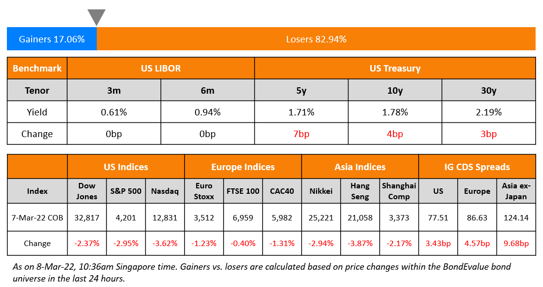 It was a sea of red again on Monday with US equity markets ended lower again on Monday with the S&P and Nasdaq closing 3% and 3.6% lower each. Sectoral losses were led by Materials, Financials, IT, Consumer Discretionary and Communication Services, down 3.5%-5.0%. European markets ended lower again – the DAX, CAC and FTSE were down 2%, 1.3% and 0.4% respectively. US 10Y Treasury yields picked up by 4bp to 1.78%. Brazil’s Bovespa ended 2.5% lower. In the Middle East, UAE’s ADX was down 0.3% and Saudi TASI was almost unchanged. Asian markets have opened lower – Shanghai, HSI, STI and Nikkei were down 2%, 0.5%, 0.8% and 1.2% respectively. US IG CDS spreads widened 3.4bp and HY spreads were 19.2bp wider. EU Main CDS spreads were 4.6bp wider and Crossover CDS spreads were 21bp wider. Asia ex-Japan CDS spreads were 9.7bp wider.