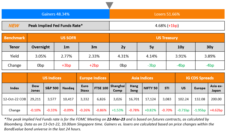 US Treasury yields eased slightly with the 5Y, 10Y and 30Y yields down 3-4bp. The peak Fed Funds Rate rose by 1bp to 4.68% for the FOMC’s March 2023 meeting. The FOMC’s September meeting minutes once again reiterated the Fed’s stance of higher rates for longer. Fed officials “emphasized the cost of taking too little action to bring down inflation likely outweighed the cost of taking too much action”. In the credit markets, US IG CDS spreads tightened 0.7bp and HY CDS spreads saw a 2.4bp tightening. US equity markets ended slightly lower with the S&P and Nasdaq down 0.3% and 0.1% respectively. The focus today is on the US inflation report where headline CPI YoY is expected at 8.1% for September and Core CPI YoY is expected at 6.5%.