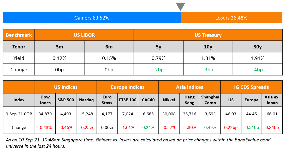 China Merchants Securities International raised $500mn via a 3Y bond at a yield of 1.295%, 44bp inside the initial guidance of T+130bp area. The bonds have expected ratings of Baa2 (Moody’s), and received orders over $3.9bn, 7.8x issue size. Proceeds will be used for supporting business development, optimizing debt structure and improving operational liquidity. The bonds will be issued by CMS International Gemstone and guaranteed by China Merchants Securities International.