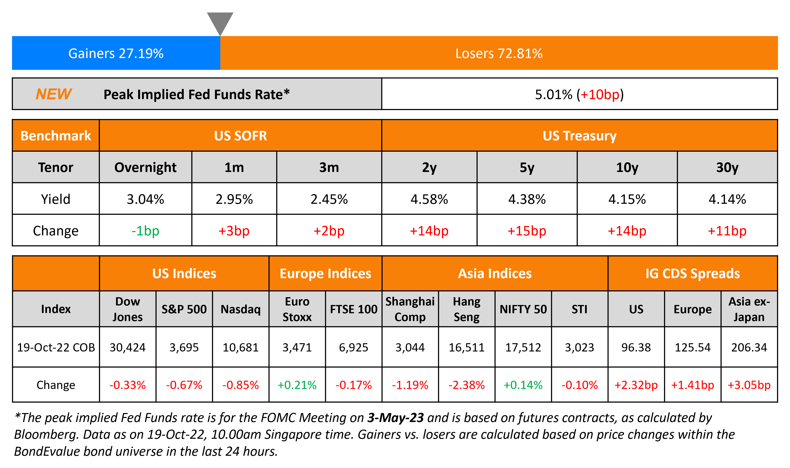 The peak Fed Funds rate has now crossed 5%, climbing 10bp higher on Wednesday, for the May 2023 FOMC meeting. For context, the Fed Funds rate was last seen above 5% just before the Global Financial Crisis in 2007. Treasuries sold-off across the curve as well with yields 11-15bp higher. Chicago Fed President Charles Evans said that the Fed would continue its rate hike path and that a tight policy would be required to control inflation. In the credit markets, US IG CDS spreads widened 2.3bp and HY CDS spreads saw a 12.5bp widening. US equity markets declined on Wednesday with the S&P and Nasdaq down 0.7% and 0.9% respectively.