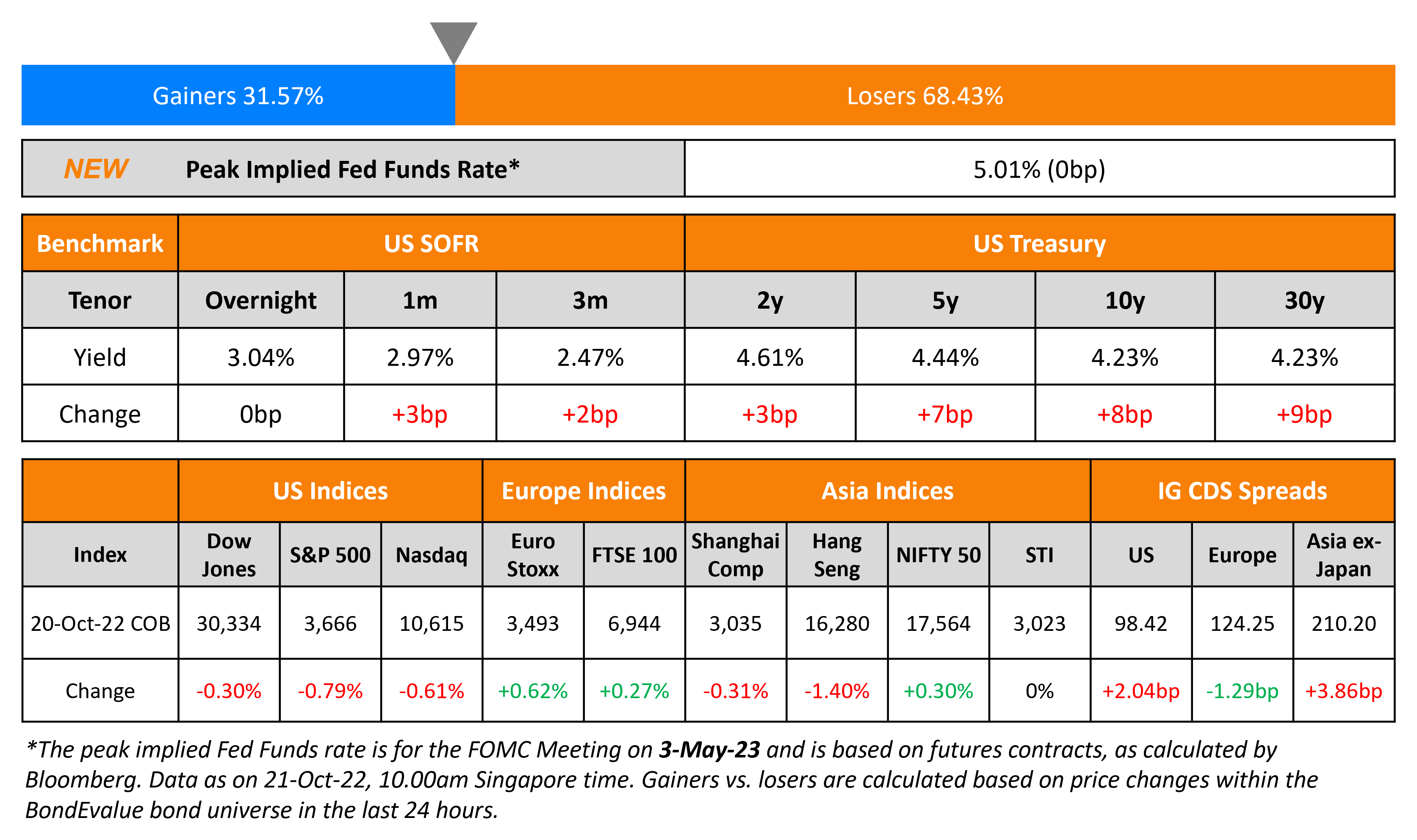 European equity markets were marginally higher yesterday. EU Main CDS spreads tightened 1.3bp while Crossover CDS spreads widened by 0.8bp. In the UK, the Prime Minister Liz Truss resigned from her post six weeks after taking up the role. Asian equity markets have opened mixed today. Asia ex-Japan CDS spreads saw a widening of over 3.9bp. Indonesia’s central bank raised its policy rates by 50bp as expected, to 4.75%.