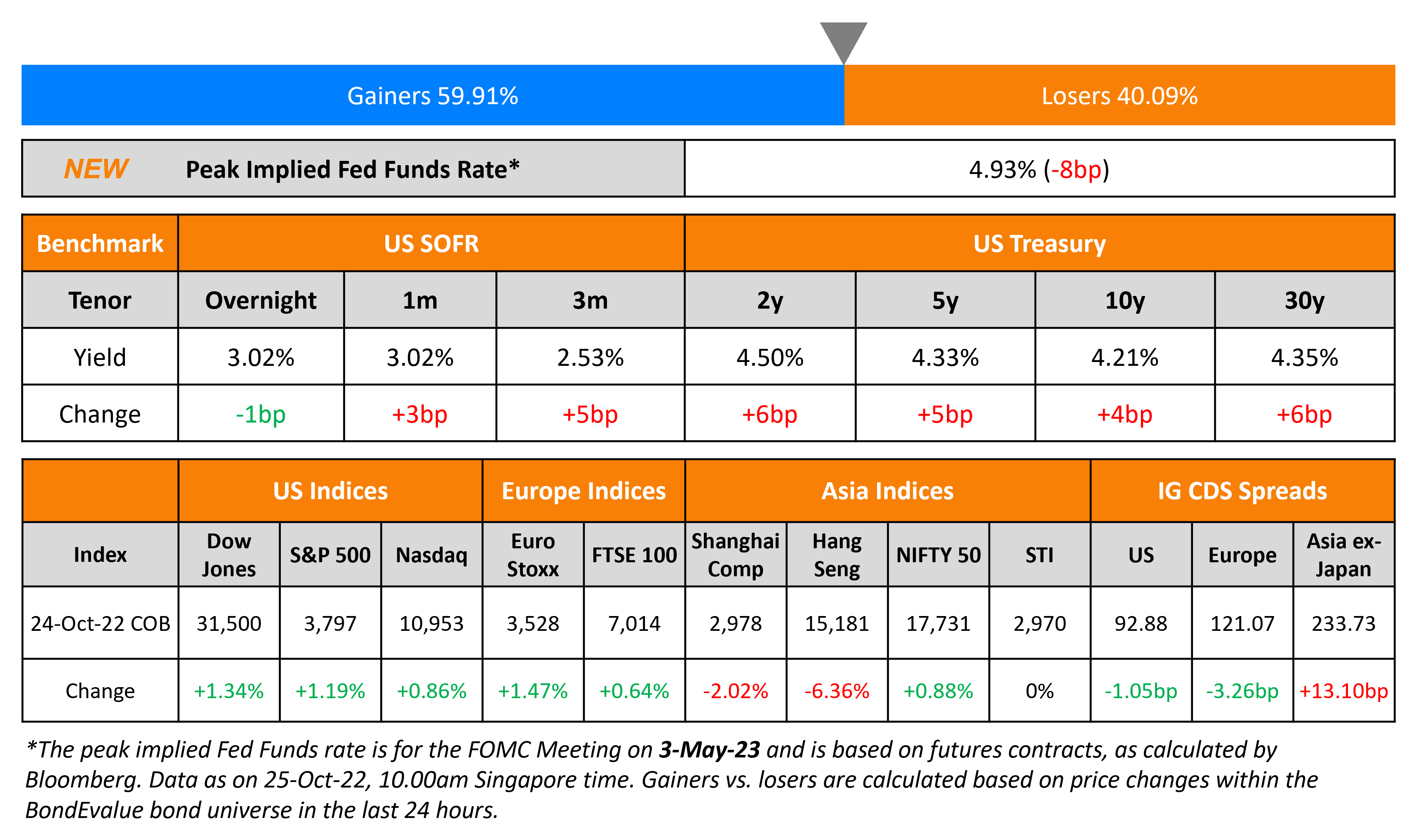 The peak Fed Funds rate fell by 8bp on Monday to 4.93% for the May 2023 FOMC meeting, after having crossed 5% last week. Treasuries sold-off on Monday with yields moving 4-6bp higher across the curve. In the credit markets, US IG CDS spreads tightened by 1.1bp and HY CDS spreads saw a 1.5bp tightening. The US Composite PMI, which tracks the manufacturing and services sectors, fell to 47.3 in October from a 49.5 print in September highlighting an economic contraction in the private sector, as services activity fell. US equity markets rallied on Monday, with the S&P and Nasdaq up 1.2% and 0.9% respectively.