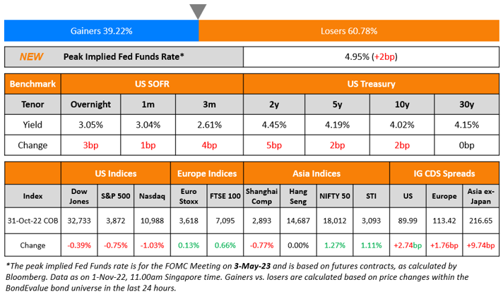 Treasuries continued to tick lower with the 2Y yield up 5bp, leading the move. The peak Fed Funds rate was up 2bp to 4.95% for the May 2023 FOMC meeting. A 75bp rate hike in Wednesday’s Federal Reserve meeting has already been priced in. However, for the December meeting, markets are evenly poised for either a 50bp or 75bp hike. Hints regarding the December meeting’s decision will be keenly watched out for in the two-day FOMC meeting which begins today and concludes tomorrow with the decision on interest rates. In the credit markets, US IG CDS spreads widened by 2.7bp and HY CDS spreads saw a 20bp widening. US equity markets moved lower on Monday, with the S&P and Nasdaq down 0.8% and 1% respectively.