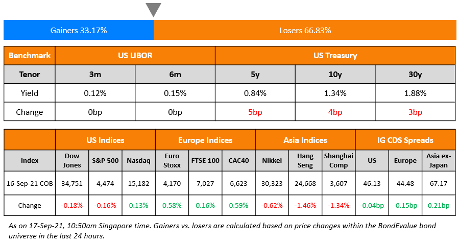 US markets ended mixed with August retail sales coming higher while the weekly jobless claims increased slightly – Nasdaq ended 0.1% higher while S&P finished 0.2% lower. Eight out of eleven sectors ended in the red. Materials and Energy down more than 1%, led the losses while Consumer Discretionary up 0.4% contributed to the gains. European stocks finished higher – CAC closed the day 0.6% higher while DAX and FTSE were up 0.2% each. Brazil’s Bovespa added another 1.1% to the week’s losses. In the Middle East, UAE’s ADX and Saudi TASI gained 0.8% and 0.1% respectively. Asian markets have started mixed as investors keenly watch HSI which has already dropped 6% in the week – HSI was down 1.5% in early trade, Shanghai and Singapore’s STI were down 0.1% while Nikkei was up 0.3%. US 10Y Treasury yields added another 4bp reaching 1.34%. US IG and HY CDX spreads tightened 0.04bp and 0.1bp respectively. EU Main CDS spreads were 0.2bp tighter and Crossover CDS spreads tightened 1.7bp. Asia ex-Japan CS spreads tightened 0.2bp. 0.4bp. Asia ex-Japan CDS