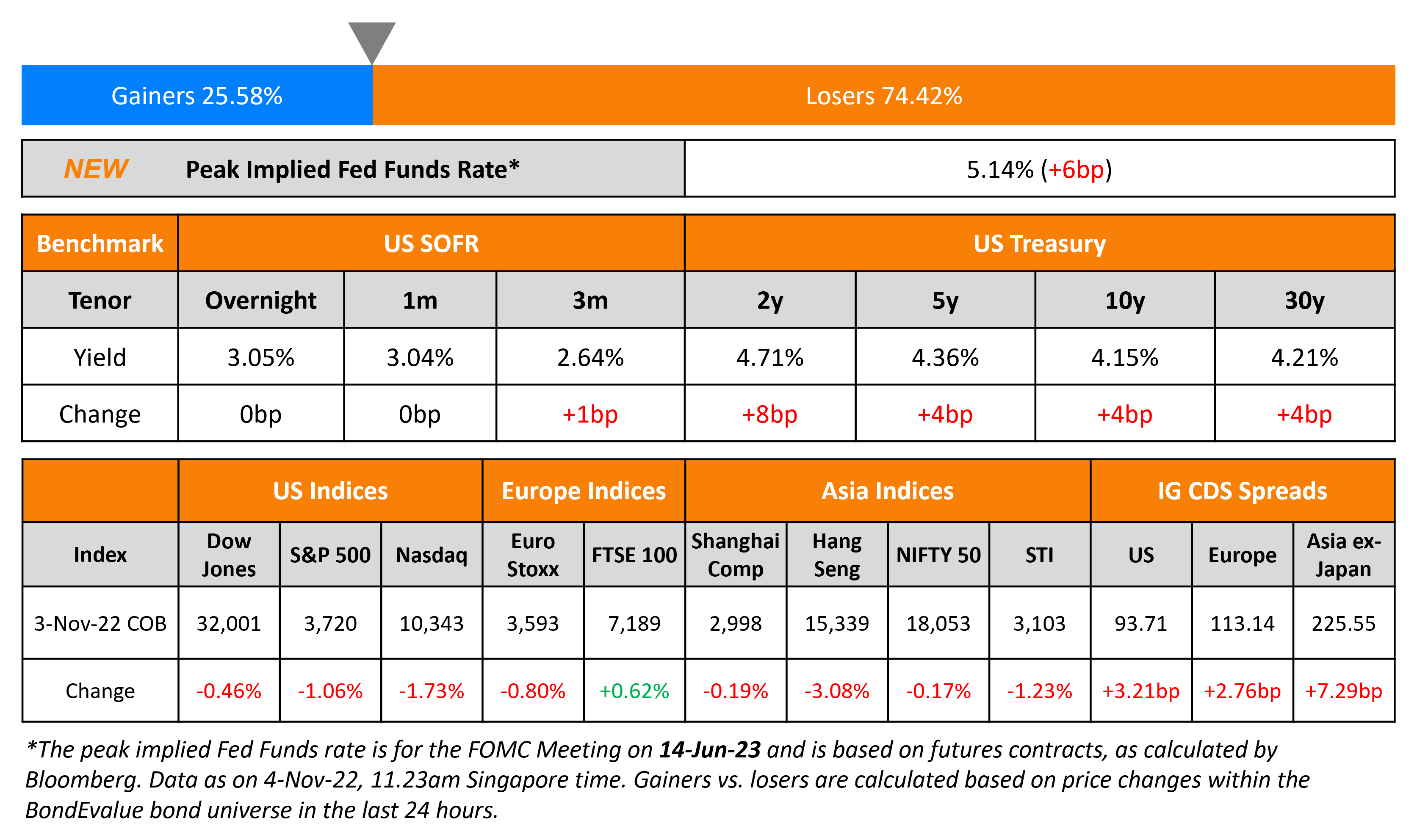 The peak Fed Funds rate moved 6bp higher to touch 5.14% for the June 2023 meeting, as Fed Chairman Powell indicated a possible higher rate in the FOMC meeting on Wednesday. Current probabilities of a 50bp hike in its December meeting stand at 45% and that of a 75bp at 55%. This compares to yesterday’s post-FOMC probabilities of 66% and 34% for a 50bp and 75bp hike respectively. US Treasury yields climbed 6-10bp higher across the curve, led by the short-end. The 2s10s yield curve currently stands at -51bp, after having briefly gone below -58bp yesterday, a four decade low. In the credit markets, US IG CDS spreads widened 3.2bp and HY CDS spreads saw a 17.9bp widening. US equity markets fell on Thursday, with the S&P and Nasdaq down 1.1% and 1.7% respectively.