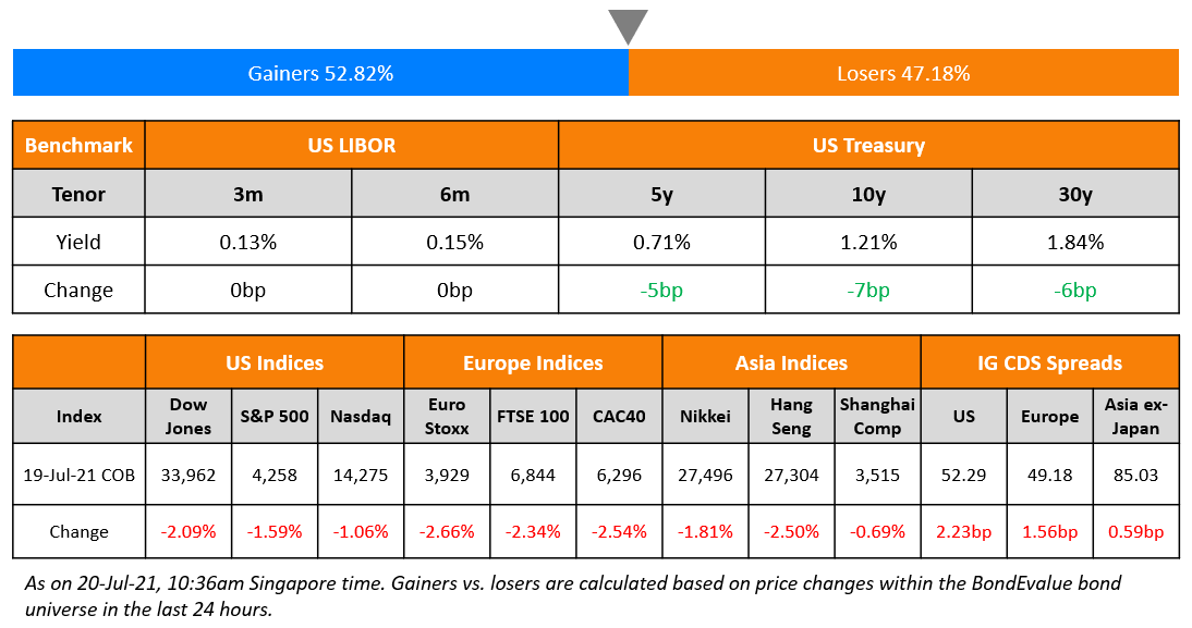 US markets started the week with the biggest drop of the year amid a sell-off over concerns over rising Delta variant cases. S&P and Nasdaq shed 1.6% and 1.1% respectively adding to the 0.8% drop on Friday. The new Covid-19 numbers seem to be overshadowing the strong earnings with sectors across the board experienced a whitewash. Energy extended its losses by another 3.6%, Financials, Materials and Industrials were all down more than 2%. Rest of the sectors with the exception of Consumer Staples were down more than 1%. Airlines and Cruise stocks fell more than 5% with Big Tech shares not spared either. US 10Y Treasury yields tightened by 7bp to 1.21% after it recovered from 1.19% – the lowest in the last five months. Germany and Belgium have started clearing the devastation caused by extensive flooding. European indices also nosedived ~2.5% – the DAX, CAC and FTSE were down 2.6%, 2.5% and 2.3% respectively. US IG CDS spreads widened 2.2bp and HY widened 10.2bp. EU Main spreads widened 1.6bp and Crossover spreads widened 8.6bp. Brazil’s Bovespa was down 1.2%. Gulf markets were spared as they were closed on account of Eid. The oil prices dropped ~2% after the successful OPEC+ deal. In Asia, Nikkei, Shanghai and HSI were down more than 0.5%. Asia ex-Japan CDS spreads were 0.6bp tighter.
