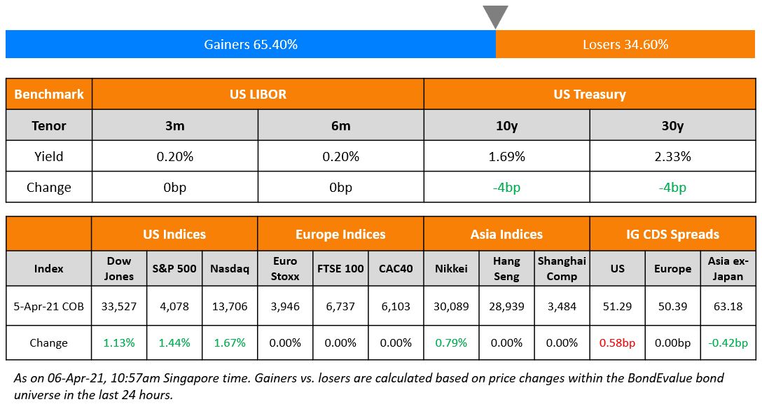 Another positive day for equities as S&P rallied 1.4% to an all-time high and Nasdaq strengthened by 1.7%. US 10Y yields eased 4bp to 1.69% even as the ISM non-manufacturing survey number for March jumped to its highest ever reading of 63.7 complementing the strong NFP number released last Friday. Most Asian and European equity markets were shut on account of Easter Monday. US IG CDS spreads were 0.6bp tighter and HY was 0.8bp tighter. Asian equity markets are flat and Asia ex-Japan CDS spreads were 0.4bp tighter.