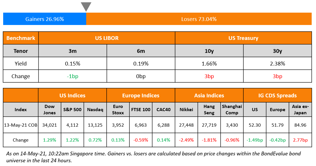 S&P rose 1.2% yesterday and Nasdaq was up 0.7%, slightly recovering losses in the prior few days. US 10Y yields had risen ~10bp to 1.70% on Wednesday in the aftermath of the inflation report, but cooled-off yesterday to 1.66%. Headline and Core CPI rose by 4.2% and 3% YoY, significantly above forecasts even after accounting for base effects causing a rout in equities. Despite the rise in inflation, Fed’s Vice-Chair Richard Clarida played down fears citing transitory factors. Oil prices dropped 3% as the US pipeline reopened after the cyber attack after paying a $5mn ransom to the hackers. US IG CDS spreads tightened 1.5bp and HY spreads tightened 6.6bp. EU main and crossover spreads tightened 0.4bp and 1.8bp. Asian equity indices have started positive, up over 1% while Asia ex-Japan CDS spreads are 2.8bp wider.