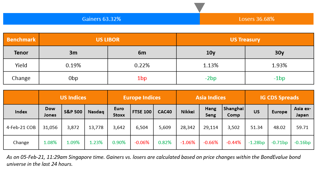 US markets saw another move higher as S&P and Nasdaq were up 1.1% and 1.2%. US jobless claims dipped by 33k to 779k last week while expected progress towards passing President Biden’s $1.9trn fiscal relief bill helped keep sentiment positive. US Treasury yields firmed with the 5s30s at its steepest level since Oct 2015 (Term of the day: curve steepening, explained below) trading at 147.3bp. “Economic activity is going up and it is already going to be fairly strong… More stimulus just makes the already strong number stronger” said Tom Porcelli, chief US economist at RBC Capital Markets. In the Eurozone, Italy’s FTSE MIB outperformed, up 1.65% a day after former ECB chief Draghi agreed to try and form a new government. US IG CDS spreads were 1.3bp tighter and HY was 7bp tighter. EU main CDS spreads tightened 0.7bp and crossover spreads tightened 4bp. Asia ex-Japan CDS spreads are 0.2bp tighter while Asian equities are ~0.5% higher today.