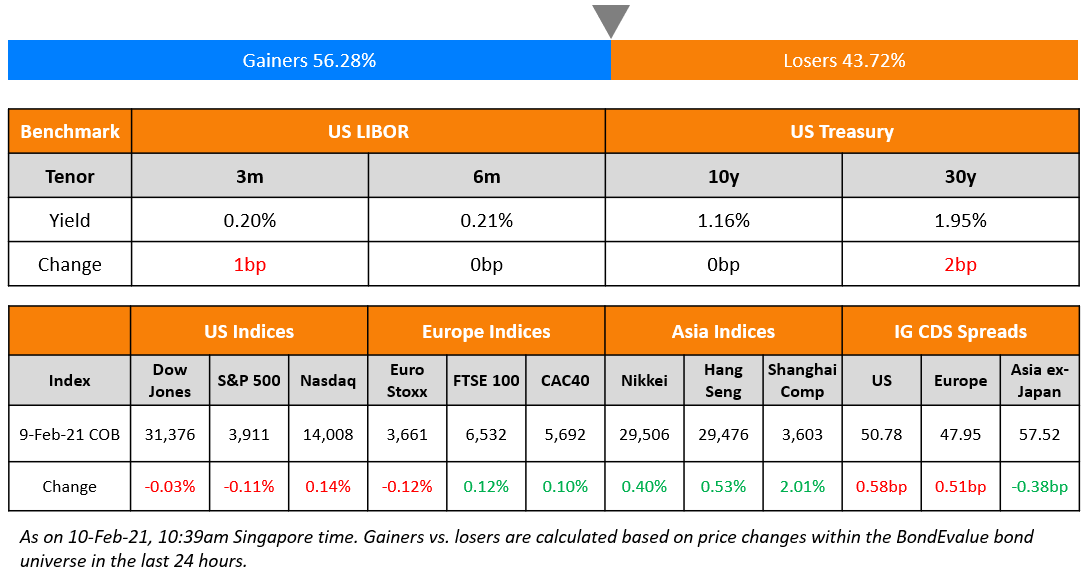 US equities saw the momentum ease a bit as S&P ended 0.1% lower and Nasdaq 0.1% higher. Twitter reported better than expected earnings while warning of slowing user growth. Brent crude is at its highest in more than a year at $61/bbl. US 10Y Treasury yields eased from the day’s high over 1.18% to 1.16%. Similar to the US, European equities were also near flat. US IG CDS spreads were 0.6bp wider and HY was 3.7bp wider. EU main CDS spreads widened 0.5bp while crossover spreads widened 1.9bp. Asia ex-Japan CDS spreads are 0.4bp tighter while Asian equities are mixed to slightly lower today.