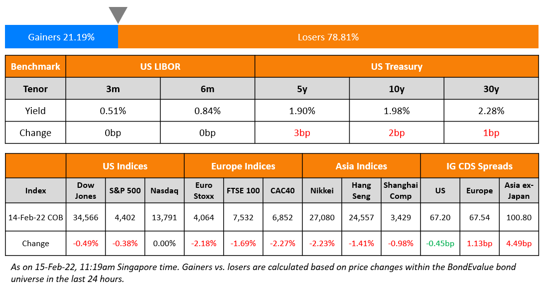 S&P ended 0.4% lower while the Nasdaq was flat yesterday. Sectoral losses were led by energy, down 2.2%, followed by Financials, Healthcare and Real Estate, down over 1%. the US 10Y Treasury yield rose slightly by 2bp to 1.98%. European markets were lower with the DAX, CAC and FTSE down 2%, 2.3% and 1.7% each. Brazil’s Bovespa closed 0.2% higher. In the Middle East, UAE’s ADX was up 0.8% and Saudi TASI closed 1.5% higher. Asian markets have opened with a broad negative bias with the HSI down 0.7%, STI and Nikkei down 0.2% each, while Shanghai was up 0.4%. US IG CDS spreads were 0.5bp tighter and HY CDS spreads were 0.6bp wider. EU Main CDS spreads were 1.1bp wider and Crossover CDS spreads were 7bp wider. Asia ex-Japan CDS spreads were 4.5bp wider.