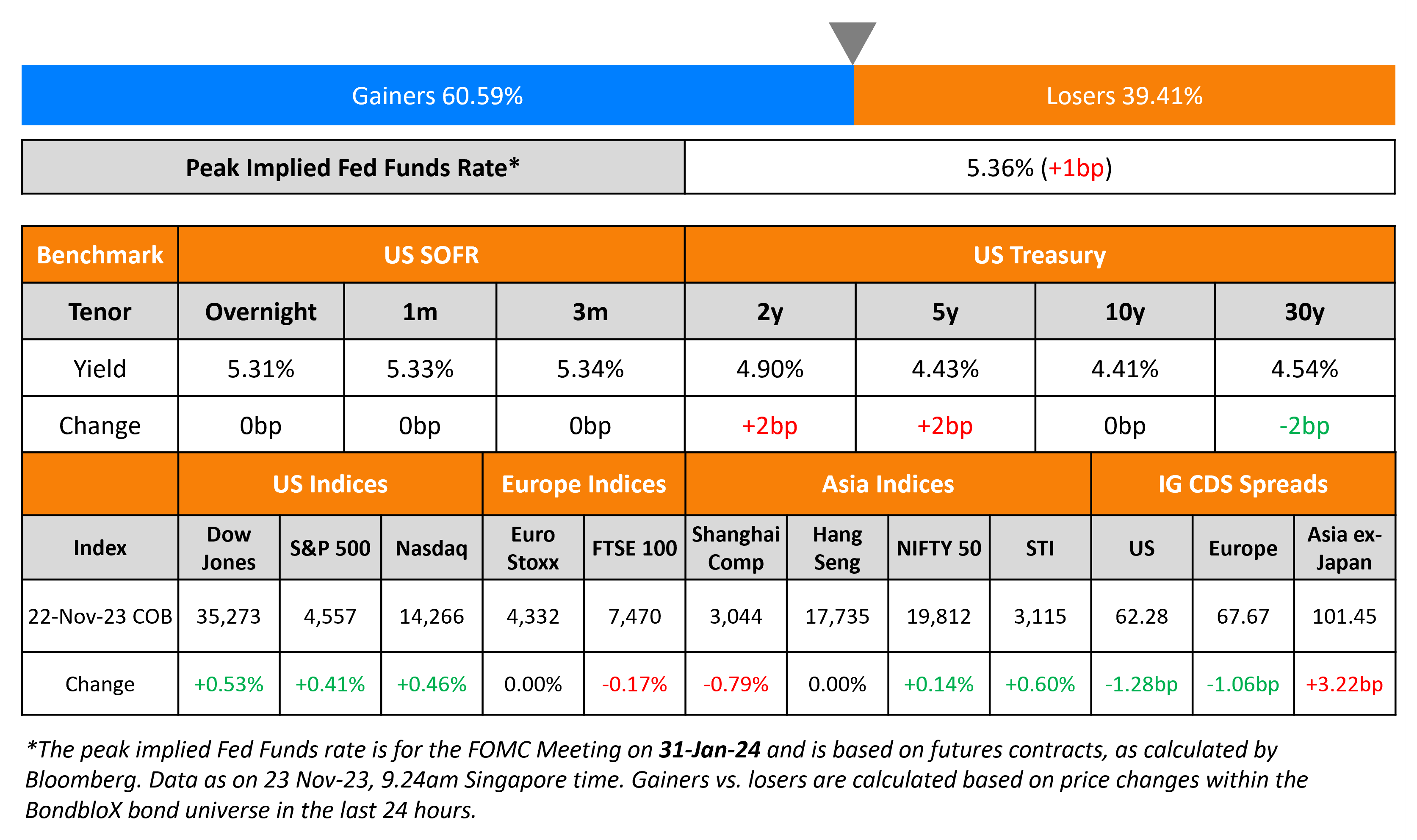 US Treasury yields were broadly flat across the curve on Wednesday. US initial jobless claims fell by 24k to 209k in the week ending November 18, better than the estimated 227k. Durable Goods Orders fell 5.4% YoY, worse than expectations of a 3.2% drop. Capital Goods Orders also dropped, by 0.1%, lower than expectations of a pick-up by 0.1%. US credit markets saw IG CDS spreads tighten 1.3bp and HY spreads tighten by 6.6bp. S&P and Nasdaq rose 0.4-0.5% respectively, ahead of the Thanksgiving holidays
