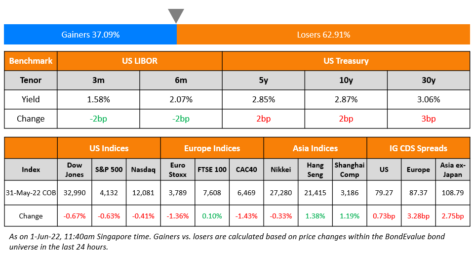 US equity markets ended lower on Tuesday with the S&P and Nasdaq down 0.6% and 0.4%, after the Memorial Day holiday on Monday. US 10Y Treasury yields were 2bp higher to 2.84%. European markets were broadly lower with the DAX and CAC down 1.3-1.4%, while FTSE was marginally up by 0.1%. Brazil’s Bovespa closed 0.3% higher. In the Middle East, UAE’s ADX was up 1.5% and Saudi TASI was up 0.3%. Asian markets have opened mixed today – Shanghai was flat and HSI was down 0.8%, while STI and Nikkei were up 0.5% and 0.7% each. US IG CDS spreads widened bp and HY spreads were 4.2bp wider. EU Main CDS spreads were 3.30.7bp wider and Crossover spreads were 16.9bp wider. Asia ex-Japan CDS spreads were 2.8bp wider.