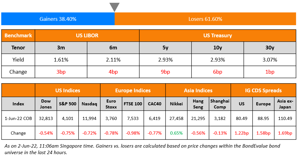 US equity markets ended lower on Wednesday with the S&P and Nasdaq down 0.7% and 0.8%. US 10Y Treasury yields were 6bp higher to 2.93%. European markets were lower with the DAX, CAC and FTSE down 0.3%, 0.8% and 1% respectively. Brazil’s Bovespa closed unchanged from previous day’s levels. In the Middle East, UAE’s ADX was down 1.6% and Saudi TASI was down 1.2%. Asian markets have opened broadly lower today – HSI, STI and Nikkei were down 1.6%, 0.4% and 0.1% each while Shanghai was up 0.1%. US IG CDS spreads widened 1.2bp and HY spreads were 4.8bp wider. EU Main CDS spreads were 1.6bp wider and Crossover spreads were 8.5bp wider. Asia ex-Japan CDS spreads were 1.7bp wider.