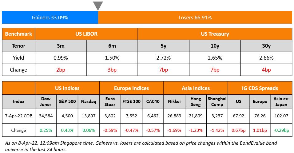 US equity markets rose slightly with the S&P and Nasdaq up 0.4% and 0.1% each. Sectoral gains were led by Healthcare, Energy and Consumer Staples, up over 2% each. US 10Y Treasury yields moved 7bp higher to 2.65%. European markets were lower – the DAX, CAC and FTSE were down 0.5%, 0.6% and 0.5%. Brazil’s Bovespa ended 0.5% higher. In the Middle East, UAE’s ADX was down 0.7% and Saudi TASI was up 0.4%. Asian markets have opened with a negative bias – Shanghai, HSI and STI were down 0.1%, 0.6% and 0.8% while Nikkei was up 0.1%. US IG CDS spreads widened 0.7bp and HY spreads were 4.2bp wider. EU Main CDS spreads were 1bp wider and Crossover CDS spreads were 6.3bp wider. Asia ex-Japan CDS spreads tightened 0.3bp.