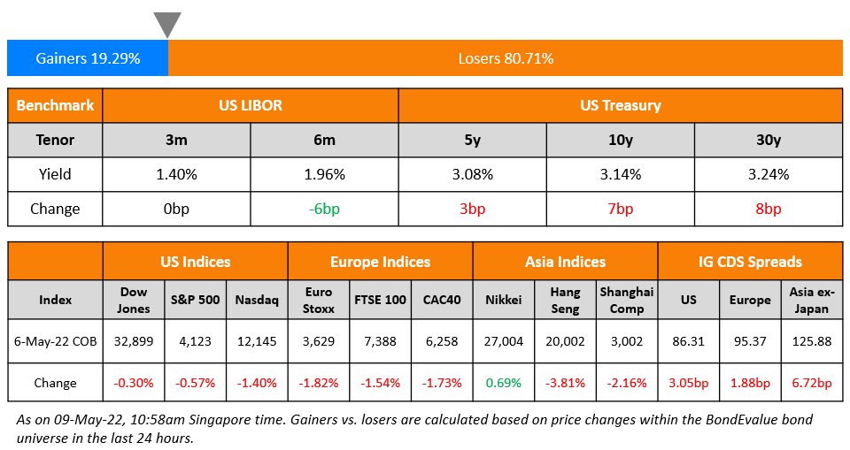 US equity markets dropped again on Friday with the S&P and Nasdaq closing 0.6% and 1.4% lower respectively. Sectoral losses were led by Consumer Discretionary, Communication Services and Materials down over 1.3% each. US 10Y Treasury yields move 7bp higher to 3.14%. European markets dropped – the DAX, CAC and FTSE were down 1.6%, 1.7% and 1.5%. Brazil’s Bovespa closed 0.6% lower. In the Middle East, UAE’s ADX was flat while Saudi TASI closed 0.6% higher on Sunday. Asian markets have opened with a negative bias- STI and Nikkei were down 0.1% and 2.2% while Shanghai was flat and HSI was closed. US IG and HY CDS spreads widened 3.1bp and 20bp respectively. EU Main CDS spreads were 1.9bp wider and Crossover spreads were 9.5bp wider. Asia ex-Japan CDS spreads were 6.7bp wider.