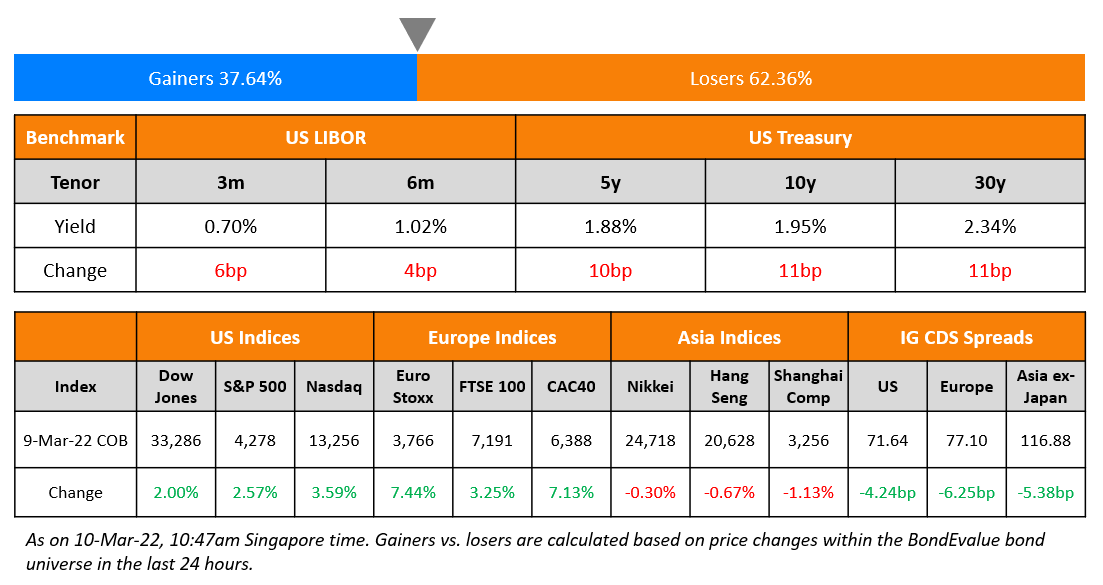 US equity markets saw a sharp rebound on Wednesday with the S&P and Nasdaq closing 2.6% and 3.6% higher. Sectoral gains were led by IT and Financials, up over 3.5% each. European markets saw a massive rally – the DAX, CAC and FTSE were up 7.1%, 7.9% and 3.3% respectively. DAX and CAC registered their largest 1D price gains since March 24, 2020 and November 9, 2020. US 10Y Treasury yields jumped up by 11bp to 1.95% as risk-on sentiment took over. Brazil’s Bovespa ended 2.4% higher. In the Middle East, UAE’s ADX was down 2.2% and Saudi TASI was down 0.9%. Asian markets have opened strong – Shanghai, HSI, STI, Nikkei were up 1.9%, 1.3%, 1.2% and 3.7% respectively. US IG CDS spreads tightened 4.2bp and HY spreads were 23.5bp tighter. EU Main CDS spreads were 6.3bp wider and Crossover CDS spreads were 35.5bp tighter. Asia ex-Japan CDS spreads were 5.4bp tighter.