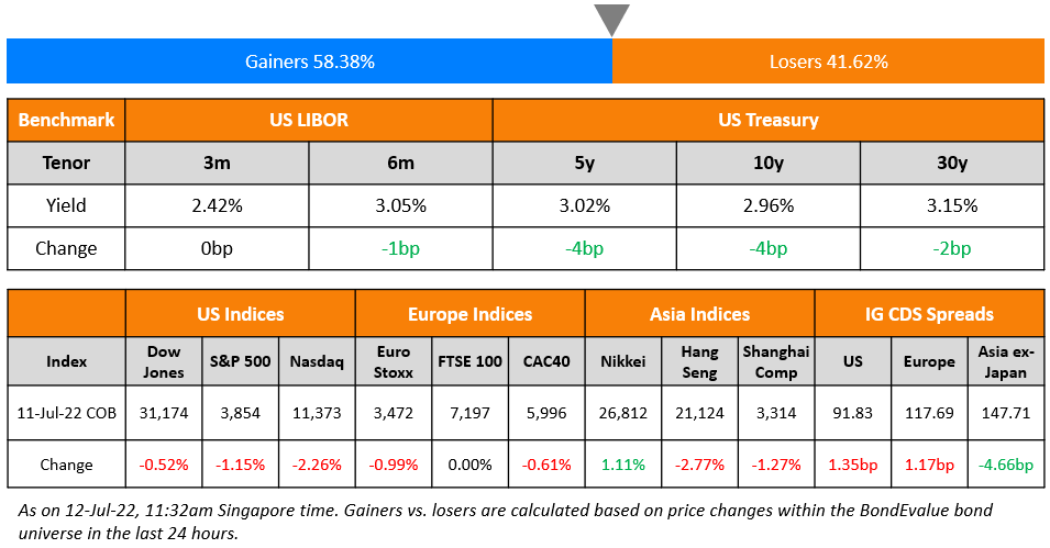 US equity markets started the week lower on Monday with the S&P and Nasdaq down 1.2% and 2.3% respectively. Sectoral losses were led by Communication Services and Consumer Discretionary fell 2.8% each. US 10Y Treasury yields were 4bp lower at 2.96%. European markets were broadly lower with the DAX and CAC down 1.4% and 0.6% respectively while FTSE was flat. Brazil’s Bovespa trended lower 2.1%. In the Middle East, UAE’s ADX and Saudi TASI were closed due to festive holidays. Asian markets opened mixed – Shanghai, HSI and Nikkei were down 0.9%, 1.4% and 1.7% respectively while STI was up 0.1%. US IG CDS spreads widened 1.4bp and US HY spreads were wider by 14.8bp. EU Main CDS spreads were 1.2bp wider and Crossover spreads were wider by 8.8bp. Asia ex-Japan IG CDS spreads narrowed by 4.7bp.