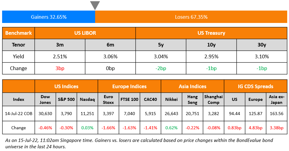 US equity markets opened sharply lower by over 1.8% on Thursday and recovered later before closing – the S&P was down 0.3% and Nasdaq was flat. Sectoral losses were led by Financials with JPMorgan and Morgan Stanley kicking-off the earnings season with soft results (scroll below for details) and Energy, falling 1.9% each. US 10Y Treasury yields were 1bp down to 2.95%. European markets trended lower with the DAX, CAC and FTSE down 1.9%, 1.4%, and 1.6% respectively. Brazil’s Bovespa fell 1.8%. In the Middle East, UAE’s ADX gained 0.9% while Saudi TASI was down 1.1%. Asian markets opened mixed – Shanghai and HSI were down 0.2% and 1.2% respectively while Nikkei and STI were up 0.6% and 0.3% respectively. US IG CDS spreads widened 0.8bp and US HY spreads were wider by 8bp. EU Main CDS spreads were 4.8bp wider and Crossover spreads were wider by 22.2bp. Asia ex-Japan IG CDS spreads widened 3.4bp.