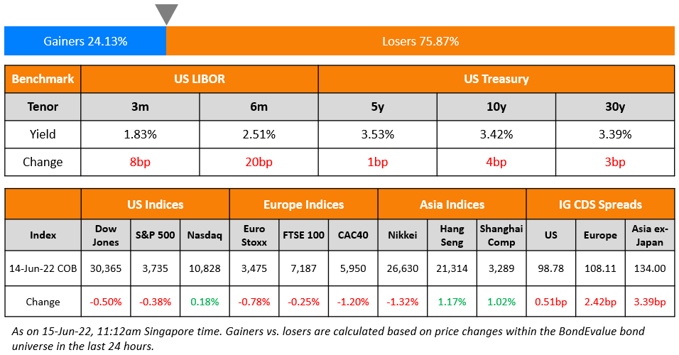 US equity markets trimmed down the heightened daily losses over the last few days with the S&P down 0.4%, while Nasdaq was up 0.2% on Tuesday. Sectoral losses were led by Utilities, down over 2.6% followed by Consumer Staples and Health Care, down over 1.3% and 1% respectively. US 10Y Treasury yields rose 4bp to 3.42% ahead of the FOMC meeting due later today. European markets ended lower with the DAX, CAC and the FTSE down 0.9%, 1.2% and 0.3% each. Brazil’s Bovespa was down 0.52%. In the Middle East, UAE’s ADX was up 0.9% while Saudi TASI closed 0.3% lower on Tuesday. Asian markets have broadly higher – Shanghai, HSI, were up 1.4% each, STI rose 0.5% while Nikkei was down 0.7%. US IG CDS spreads widened 0.5bp and HY spreads were 0.3bp tighter. EU Main CDS spreads were 2.4bp wider and Crossover spreads were 10bp wider. Asia ex-Japan IG CDS spreads widened 3.4bp.
