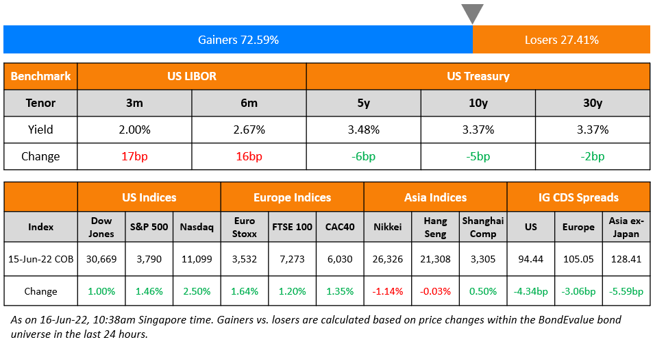 US equity markets jumped higher on Wednesday with the S&P and Nasdaq up 1.5% and 2.5% respectively. Sectoral gains were led by Consumer Discretionary, up 3% and Communication Services, up 2.4%. US 10Y Treasury yields fell 5bp to 3.37%. While the US Fed hiked by 75bp, the meet was considered a little less hawkish (scroll below for details on the FOMC meeting). European markets ended higher with the DAX and CAC up 1.4% each and the FTSE up 1.2%.. Brazil’s Bovespa was up 0.7%. In the Middle East, UAE’s ADX was up 0.4% while Saudi TASI closed 0.4% lower. Asian markets have opened broadly higher – Shanghai, STI and Nikkei were up 0.2%, 1.1% and 1% respectively while HSI was down 0.4%. US IG CDS spreads tightened 4.3bp and HY spreads were 22bp tighter. EU Main CDS spreads were 3.1bp tighter and Crossover spreads were 17bp tighter. Asia ex-Japan IG CDS spreads tightened 5.6bp.