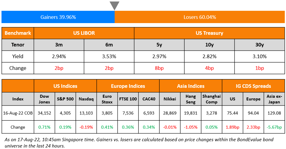 US equity markets ended mixed on Tuesday with the S&P up 0.2% while Nasdaq was down 0.2%. Sectoral gains were led by Consumer Staples, up 1.2% and Consumer Discretionary rising by 1.1% while Real Estate was down 0.4%. US 10Y Treasury yields rose by 4bp to 2.82%. European markets were in the green – DAX, CAC and FTSE were up 0.7%, 0.3% and 0.4% respectively. Brazil’s Bovespa was up 0.4%. In the Middle East, UAE’s ADX was down 0.2% while Saudi TASI was flat. Asian markets have opened higher – Shanghai, HSI, Nikkei and STI were up 0.3%, 0.8%, 0.8% and 0.3% respectively. US IG CDS spreads widened 1.9bp and US HY spreads were wider by 11.2bp. EU Main CDS spreads were 2.3bp wider and Crossover spreads were 10.2bp wider. Asia ex-Japan IG CDS spreads tightened 5.7bp.