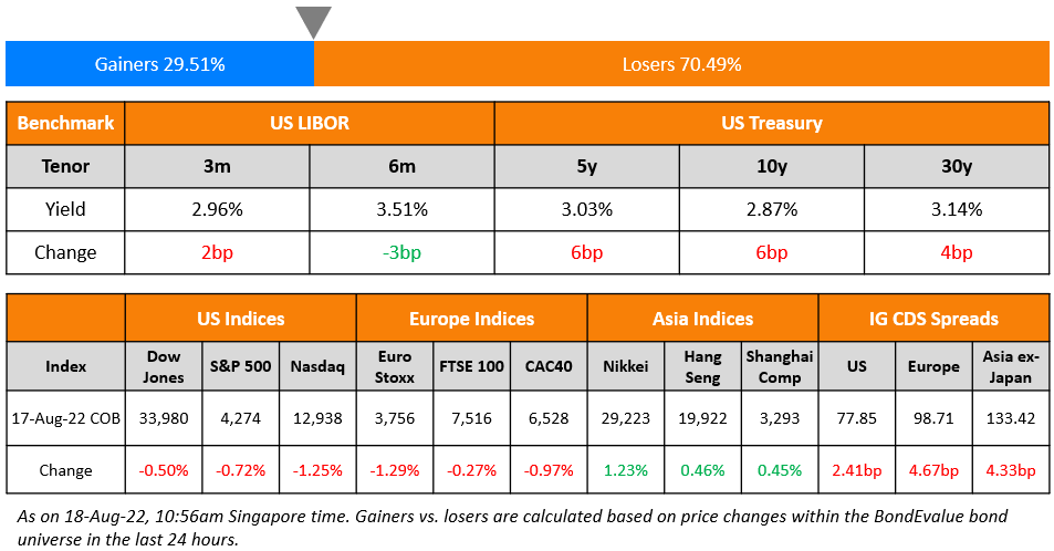 The US Federal Reserve’s July meeting minutes showed that the committee’s participants “agreed that there was little evidence to date that inflation pressures were subsiding and a slowing in aggregate demand would play an important role in reducing inflation pressures.” Analysts note that the Fed did not guide for a September meet rate hike in the minutes, but committed to hike rates to control inflation while also acknowledging the importance of timing the slowing down of the pace of rate hikes. Separately, UK inflation rose to a 40Y high of 10.1% YoY in July on the back of higher food prices, much higher than the 9.4% print in June. Citi expects UK inflation to peak at 15% levels in Q1 of next year.