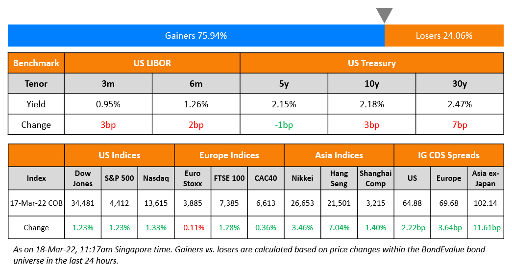 US equity markets closed higher for a third consecutive day, with the S&P and Nasdaq up 1.2% and 1.3%. Sectoral gains were led by Energy, up 3.5%, followed by Material and Consumer Discretionary, up over 1.9% each. US 10Y Treasury yields were up 3bp to 2.18%. European markets were mixed – the DAX was down 0.4% while CAC and FTSE were up 0.4%, and 1.3%. Brazil’s Bovespa ended 1.8% higher. In the Middle East, UAE’s ADX was up 0.2% and Saudi TASI was up 0.9%. Asian markets have opened mixed – Shanghai and HSI were down 0.2% and 2.4% while STI was flat and Nikkei was up 0.3%. US IG CDS spreads tightened 2.2bp and HY spreads were 7.5bp tighter. EU Main CDS spreads were 3.6bp tighter and Crossover CDS spreads were 12.6bp tighter. Asia ex-Japan CDS spreads were 11.6bp tighter.