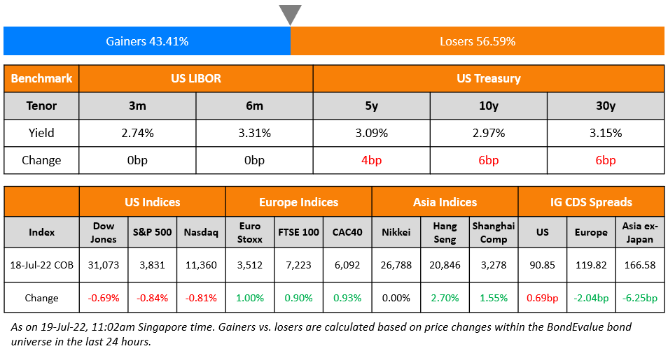 US equity markets started the week lower on Monday with the S&P and Nasdaq down 0.8% each. Sectoral losses were led by Healthcare, down 2.15% followed by Utilities dropping 1.4% while Energy posted a gain of 2%. US 10Y Treasury yields were 6bp higher at 2.97%. European markets were in the green with the DAX up 0.7% and the CAC and FTSE up 0.9% each. Brazil’s Bovespa was up 0.4%. In the Middle East, UAE’s ADX closed 0.1% higher and Saudi TASI rose 2.3%. Asian markets have opened broadly lower – Shanghai, HSI, and STI were down 0.3%, 1.1% and 0.3% respectively while Nikkei was up 0.7%. US IG CDS spreads were wider by 0.7bp and US HY spreads widened by 3.4bp. EU Main CDS spreads were 2bp tighter and Crossover spreads were tightened by 15.6bp. Asia ex-Japan IG CDS spreads tightened 6.3bp.