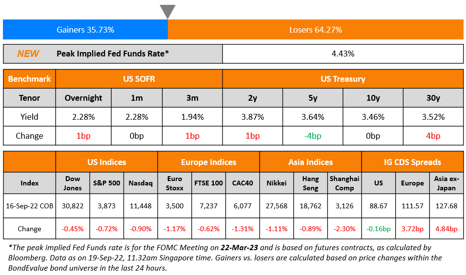 The Effective Fed Funds Rate currently stands at 2.33%, implying another ~200bp in rate hikes over the next six months. As of Friday, markets were pricing in an 85% probability of a 75bp hike at Wednesday’s FOMC meeting with an 18% chance of a 100bp rate hike. US credit markets saw IG CDS spreads tighten by 0.2bp and US HY spreads widening 26.3bp. US equity markets ended lower on Friday with the S&P and Nasdaq down 0.7% and 0.9% respectively.