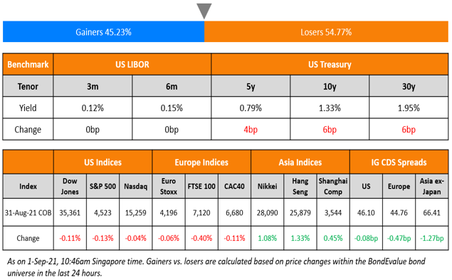 US markets slid marginally but still carved out a seventh straight month of gains – both Nasdaq and S&P ended 0.1% lower. Real Estate added 0.6% while IT and Energy traded 0.6% and 0.7% lower. For the month of August, S&P gained 3% while the tech heavy Nasdaq climbed 4%. European markets also ended lower – FTSE, DAX and CAC lost 0.4%, 0.3% and 0.1% respectively. Saudi’s TASI added 0.6%. Brazil’s Bovespa extended its losses by 1.2%. Asian markets were mixed – Nikkei, HSI, KOSPI and Shanghai were up 1.1%, 1.3%, 1.7% and 0.5%, while Singapore’s STI fell 1.5%. US 10Y Treasury yields rose 6bp to 1.33%. US IG tightened by 0.1bp while HY spread widened by 0.6bp. EU Main CDS and Crossover CDS spreads tightened by 0.5bp and 0.8bp respectively. Asia ex-Japan CDS spreads tightened 1.3bp.