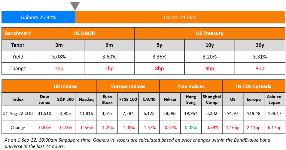 US equity markets dipped further on Wednesday with the S&P and Nasdaq down 0.8% and 0.6% respectively. Sectoral losses were led by Materials, down 1.2%, followed by Consumer Discretionary and IT declining 1% each. US 10Y Treasury yields jumped 9bp higher to 3.2%. Meanwhile, the US 2Y Treasury yield touched 3.5%, the first time since 2007 on expectations of more rate hikes by the Fed. This was especially after Powell’s hawkish speech at Jackson Hole last Friday. European markets ended lower – DAX, CAC and FTSE were down 1%,1.4% and 1% respectively. Brazil’s Bovespa fell 0.8%. In the Middle East, UAE’s ADX and Saudi TASI lost 0.9% and 1.4% respectively. Asian markets have opened mixed today – Shanghai was up 0.3%, HSI and Nikkei were down 0.9% and 1.5% respectively while STI was flat. US IG CDS spreads widened 1.2bp and US HY spreads were wider by 5.1bp. EU Main CDS spreads 2.1bp wider and Crossover spreads widened by 7.1bp. Asia ex-Japan IG CDS spreads widened 6.2bp.