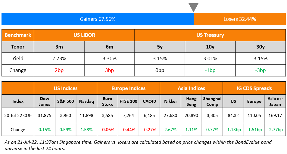 US equity markets continued its upward trend on Wednesday with the S&P and Nasdaq up 0.6% and 1.6% respectively. Sectoral gains were led by Consumer Discretionary up 1.8%, followed by IT gaining 1.6%, while Utilities were down 1.4%. US 10Y Treasury yields were 1bp down at 3.01%. European markets were lower with the DAX, CAC and FTSE down 0.2%, 0.3% and 0.4% respectively. Brazil’s Bovespa was flat. In the Middle East, UAE’s ADX and Saudi TASI were up 1% and 0.9%. Asian markets have opened mixed – Shanghai, HSI, and STI were down 0.4%, 1.2%, and 0.7% respectively while Nikkei was up 0.2%. US IG CDS spreads narrowed 1.1bp and US HY spreads were tighter by 31.5bp. EU Main CDS spreads were 1.5bp tighter and Crossover spreads were tighter by 3.2bp. Asia ex-Japan IG CDS spreads tightened 2.8bp.