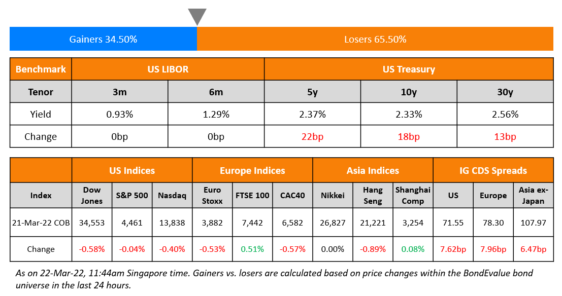 US equity markets erased early gains with the S&P closing flat and Nasdaq down 0.4%. Sectoral gains were led by Energy, up 3.8% while losses were led by Consumer Discretionary and Communication Services, down over 0.8% each. In a speech to the National Association for Business Economics, Fed Chair Jerome Powell said that he would be ready for more aggressive rate hikes if needed (scroll down to Talking Heads for details). The hawkish comments saw the curve bear flatten as yields on the short-end of curve rose more than the long end – The 2Y jumped from 1.93% to 2.17%, 5Y from 2.15% to 2.37%, 10Y from 2.15% to 2.33% and the 30Y from 2.43% to 2.56%. Post last week’s FOMC meeting, market participants were pricing in 6 more hikes of 25bp, but after Powell’s comments yesterday, Bloomberg notes that 7.5 more hikes have been penciled in. The 5s30s is at its lowest since 2007 at 19bp and the 2s10s has flattened to 16bp. European markets were mixed – the DAX and CAC were down 0.6% each while FTSE was up 0.5%. Brazil’s Bovespa ended 0.7% higher. In the Middle East, UAE’s ADX was down 0.5% and Saudi TASI was down 0.3% on Sunday. Asian markets have opened with a positive bias – Shanghai, HSI and Nikkei were up 0.1%, 1.3% and 1.5% each while STI was down 0.2%. US IG CDS spreads tightened 1bp and HY spreads were 8.7bp wider. EU Main CDS spreads were 0.7bp wider tighter and Crossover CDS spreads were 34.8bp wider. Asia ex-Japan CDS spreads were 0.6bp tighter.