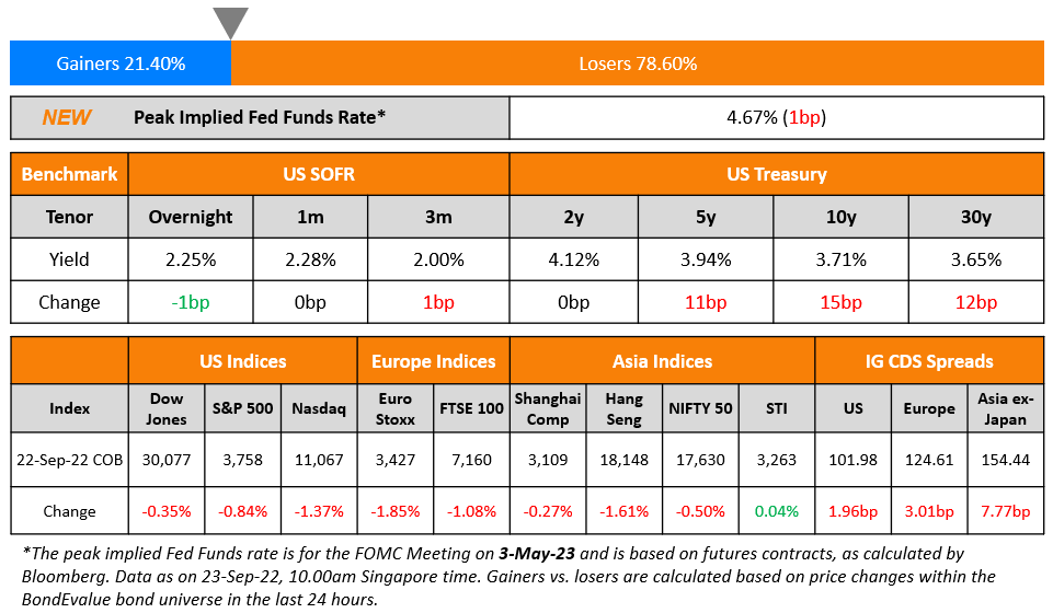 European equity markets were down ~1.5%, and credit markets saw EU Main CDS spreads rise by 3.1bp and Crossover spreads move 17.8bp higher. The Bank of England (BoE) hiked its benchmark rates by 50bp to 2.25% and indicated that it will respond forcefully and as necessary to counter inflation. The BoE expects inflation to peak just below 11% in October and after that to remain above 10% for a few months. Inflation in the UK in August stood at 9.9% YoY. The Swiss National Bank (SNB) also hiked its policy rate, by 75bp to 0.5% from -0.25%, thereby exiting over seven years of negative interest rates.
