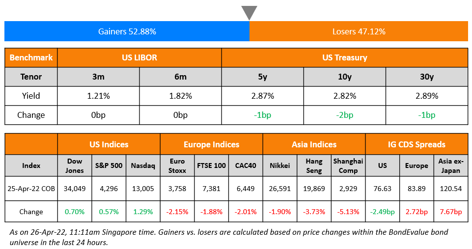 The S&P and Nasdaq recovered yesterday after consecutive days of sharp losses, up 0.6% and 1.3% Sectoral gains were led by Communication Services and IT, up 1.4-1.6%. US 10Y Treasury yields eased 2bp to 2.82%. European markets closed lower with the DAX, CAC, FTSE down 1.5% 2% and 1.9%. Brazil’s Bovespa closed 0.4% lower. In the Middle East, UAE’s ADX was down 0.9% while Saudi TASI was up 0.6%. Asian markets have opened sharply lower – Shanghai, HSI and Nikkei were down 2.4%, 2.6% and 1.7% while STI was down 0.2%. US IG and HY CDS spreads tightened 2.5bp and 11.3bp respectively. EU Main CDS spreads were 2.7bp wider and Crossover spreads were 11.1bp wider. Asia ex-Japan CDS spreads were 7.7bp wider.