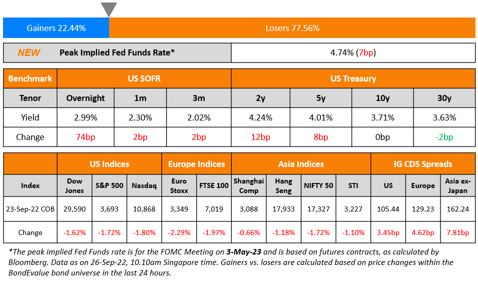 European equity markets were also down by ~2%, and credit markets saw EU Main CDS spreads rise by 4.6bp and Crossover spreads move 18bp higher. The UK government announced permanent tax cuts costing £45bn per year ($47bn) and plans to borrow an additional borrowing of £72bn ($79bn) over the next six months. This comes as UK’s budget deficit is expected to hit 8% of GDP in 2022/23 as per the NIESR. The sterling fell 3% post the announcement to a 37-year low at below 1.09 to the dollar. Meanwhile 5Y UK gilt yields jumped by a massive 50bp, the largest daily spike in 31 years, to 4.06% while the 10Y rose 33bp to 3.83%.