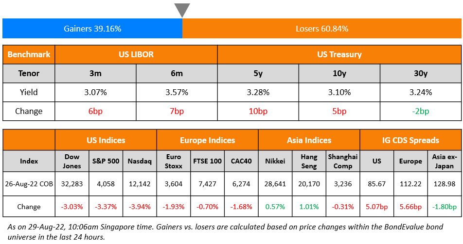US equity markets fell sharply on Friday with the S&P and Nasdaq closing 3.4% and 3.9% lower respectively on Jerome Powell’s hawkish speech at the Jackson Hole conference. Sectoral losses were led by IT, down 4.3% followed by Consumer Discretionary falling 3.9%. US 10Y Treasury yields jumped 5bp higher to 3.1%. European markets ended also lower – DAX, CAC and FTSE were down 2.3%, 1.7% and 0.7% respectively. Brazil’s Bovespa declined 1.1%. In the Middle East, UAE’s ADX rose 0.6% on Friday and Saudi TASI ended 0.5% lower on Sunday. Asian markets have followed western bourses, by opening lower today – Shanghai, HSI, Nikkei and STI were down 0.1%, 0.7%, 2.8% and 1.1% respectively. US IG CDS spreads widened 5.1bp and US HY spreads were wider by 29.2bp. EU Main CDS spreads were 5.7bp wider and Crossover spreads widened by 29.6bp. Asia ex-Japan IG CDS spreads tightened 1.8bp.