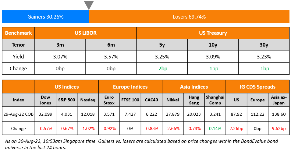 US equity markets continued its broad downward move on Monday with the S&P and Nasdaq down by 0.7% and 1% respectively. Sectoral losses were led by IT, down 1.3% and Real Estate, down 0.9% while Energy rose 1.5%. US 10Y Treasury yields were 1bp lower at 3.09%. European markets trended broadly lower – DAX and CAC were down 0.6% and 0.8% while FTSE was closed due to the summer bank holiday. Brazil’s Bovespa was flat. In the Middle East, UAE’s ADX fell 0.6% while Saudi TASI was flat. Asian markets have opened mixed today – Shanghai and HSI are down 0.6% and 0.9% respectively while Nikkei and STI were up 1% and 0.5% respectively. US IG CDS spreads widened 2.3bp and US HY spreads were wider by 14.9bp. EU Main CDS spreads were flat and Crossover spreads widened by 29.6bp. Asia ex-Japan IG CDS spreads widened 9.6bp.