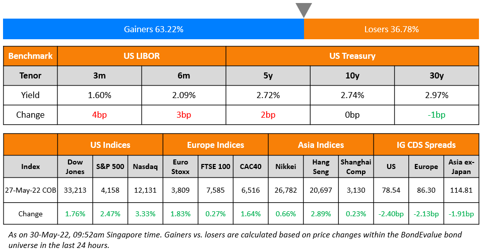 US equity markets rallied sharply for a second straight day on Friday, with the S&P and Nasdaq up 2.5% and 3.3% respectively. Sectoral gains were led by Consumer Discretionary and IT up over 3.4% each. US 10Y Treasury yields were flat at 2.74%. European markets ended higher as well with the DAX and CAC up 1.6% each and the FTSE up 0.3%. Brazil’s Bovespa closed flat. In the Middle East, UAE’s ADX was up 1.5% on Friday and Saudi TASI was up 1.3% on Sunday. Asian markets have opened stronger today – Shanghai, HSI, STI and Nikkei were up 0.6%, 1.9%, 0.2% and 2% respectively. US IG CDS spreads tightened 2.4bp and HY spreads tightened 8.2bp. EU Main CDS spreads were 2.1bp tighter and Crossover spreads were 8.2bp tighter. Asia ex-Japan CDS spreads were 1.9bp tighter.