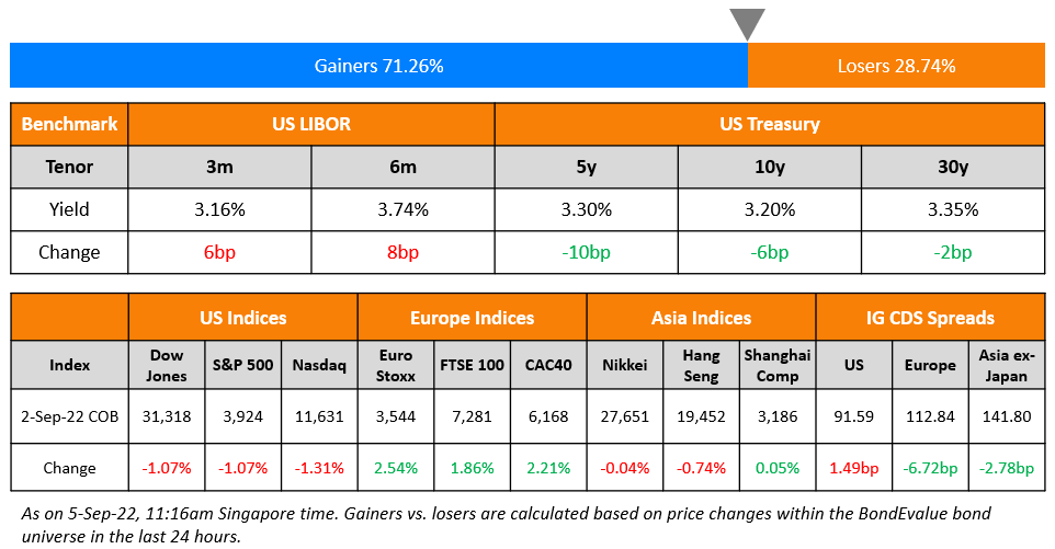 US 10Y Treasury yields fell 6bp to 3.2% and the 2Y yield was down 10bps to 3.38% after the US Non Farm Payrolls (NFP) data release on Friday. NFP for August came in at 315k, higher than projections of 298k and July’s 526k. The unemployment rate was at a six-month high of 3.7%, higher than expectations of 3.5%. Prior to the NFP release, markets were pricing in a 57% probability of a 75bp hike at the September FOMC meeting. That probability has now fallen to 54%. Markets are now pricing in a 46% probability of a 50bp hike, up from 39% a week earlier. The move in US equity markets after the data release was unenthusiastic – the S&P and Nasdaq closed 1.1% and 1.3% lower respectively. Sectoral losses were led by Communication Services, down 1.9% and Real Estate falling 1.7% while Energy rose 1.8%. US IG CDS spreads widened 1.5bp and US HY spreads were wider by 6.2bp.