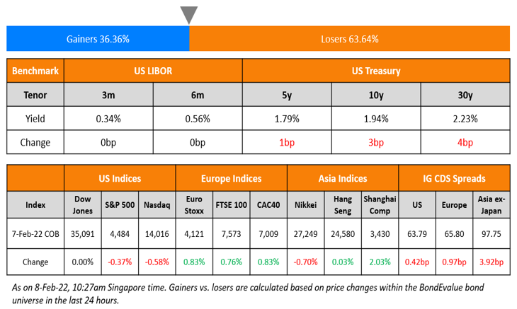 US equity markets fell with the S&P and Nasdaq ending 0.4% and 0.6% lower. Sectoral gains were led by Energy, up 1.3% while losses were led by Communication Services, down 2.2%. US 10Y Treasury yields rose 3bp to 1.94%. European markets were higher with the DAX, CAC and FTSE up 0.7%, 0.8% and 0.8%. Brazil’s Bovespa closed 0.2% lower. In the Middle East, UAE’s ADX was up 0.1% and Saudi TASI closed 0.4% higher. Asian markets have opened mixed with HSI and Shanghai down 1.54% and 0.90% while STI and Nikkei are up 0.57% and 0.24% respectively. US IG CDS spreads were 0.4bp wider and HY CDS spreads were 3.1bp wider. EU Main CDS spreads were 1bp wider and Crossover CDS spreads were 7bp wider. Asia ex-Japan CDS spreads were 3.9bp wider also.