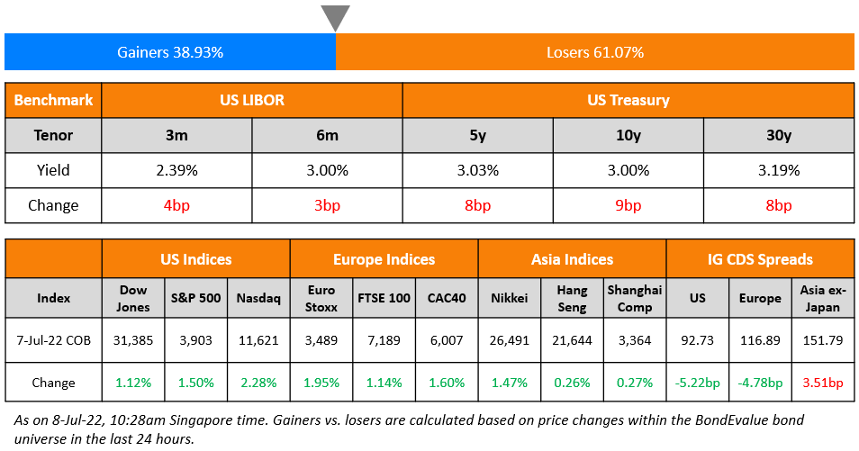 US equity markets continued to trend higher on Thursday with the S&P and Nasdaq up 1.5% and 2.3% respectively. Sectoral gains were led by Energy rose over 3.5% followed by Consumer Discretionary, up 2.5%. US 10Y Treasury yields were 9bp up at 3%. European markets also ended higher with the DAX, CAC, and FTSE rising by 2%, 1.6% and 1.1%. Brazil’s Bovespa also posted strong gains of 2%. In the Middle East, UAE’s ADX fell 0.3% while Saudi TASI gained 0.6%. Asian markets have risen to a positive start – Shanghai, STI, HSI and Nikkei were up 0.2%, 0.3% each and 1.4% respectively. US IG CDS spreads tightened 5.2bp and US HY spreads were tighter by 30.8bp. EU Main CDS spreads were 4.7bp tighter and Crossover spreads were tighter by 23.9bp. Asia ex-Japan IG CDS spreads widened 3.5bp.